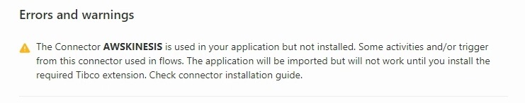 When one or more of your custom activities or triggers used in the app being imported are missing from your Flogo Enterprise installation, you see a warning in your Import App dialog similar to the following: