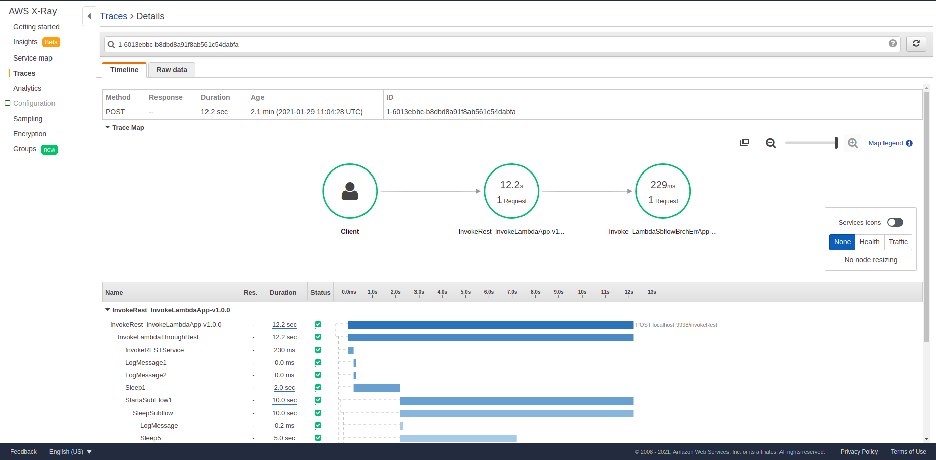 When you use AWS X-Ray for tracing, your app sends trace data to AWS X-Ray. X-Ray processes the data to generate a service map and searchable trace summaries. For each flow, subflow, and activity, details such as execution time are displayed on the AWS X-Ray dashboard.