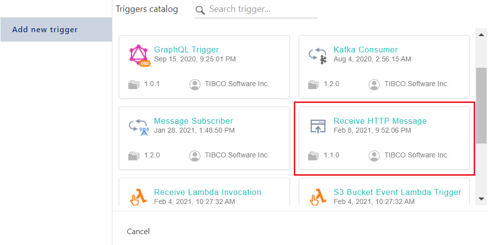 Configure trigger: ReceiveHTTPMessage dialog box: