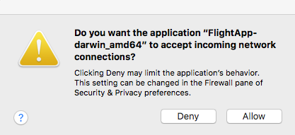 chmod +x <FlightApp-darwin_amd64>./FlightApp-darwin_amd64Note: In the commands, use the file name specific to your platform -FlightApp-linux_amd64orFlightApp-linux_86in the case of Linux. - Click