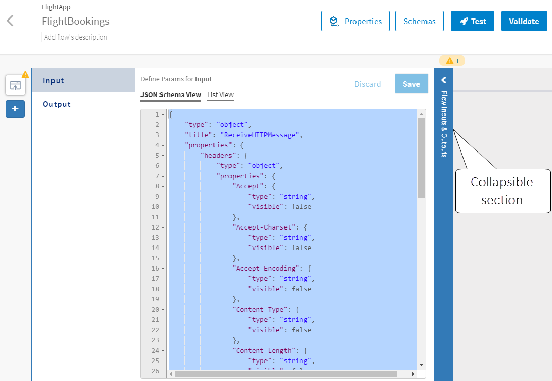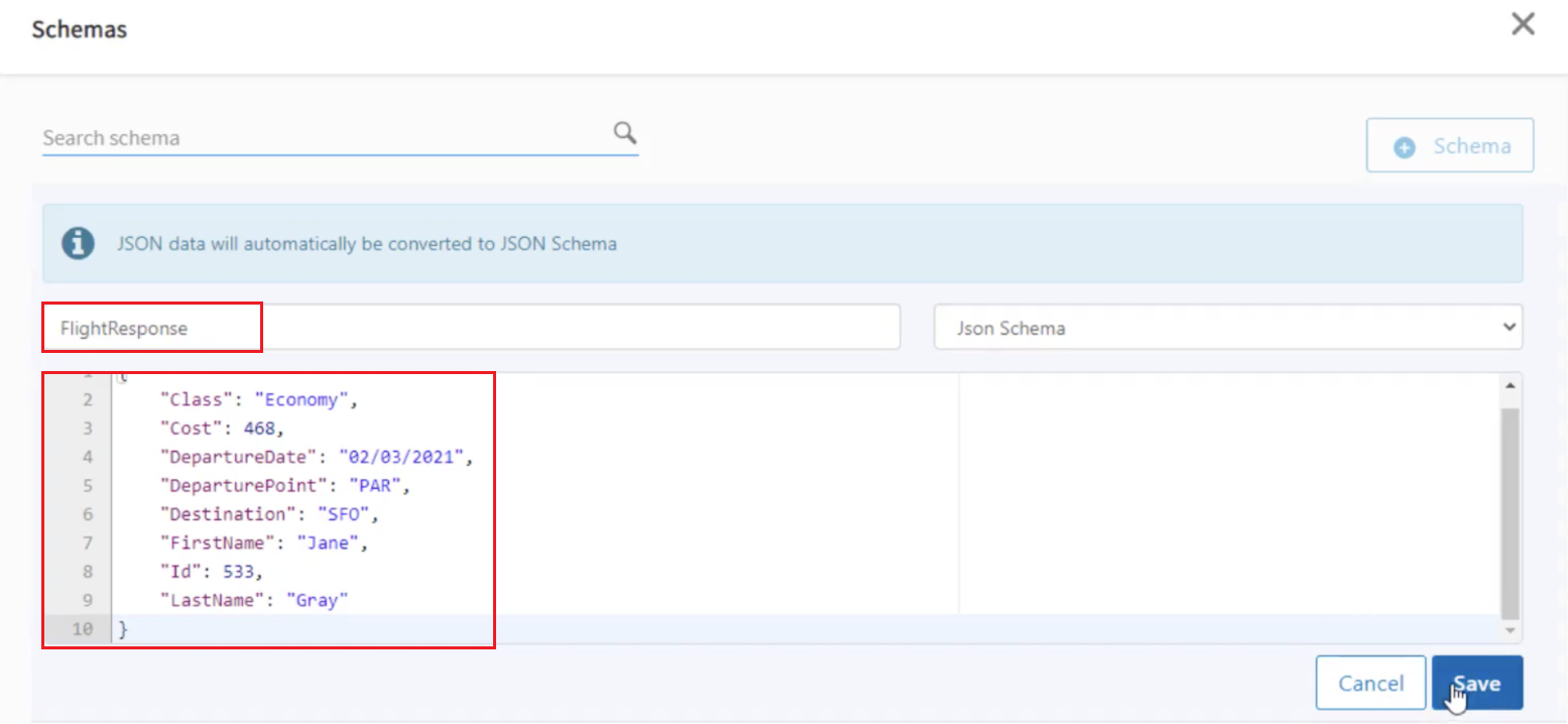 FlightResponseand paste the copied schema into the text editor. Alternatively, if you enter JSON data in the editor, the JSON data is automatically converted to JSON schema. - Click Save.