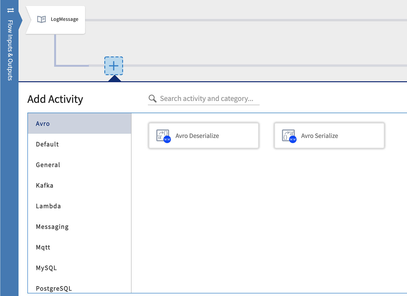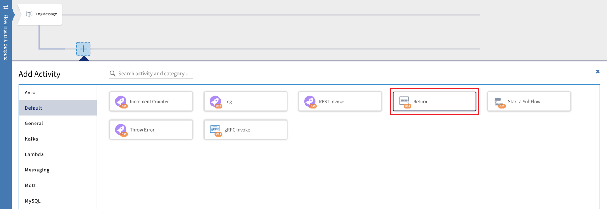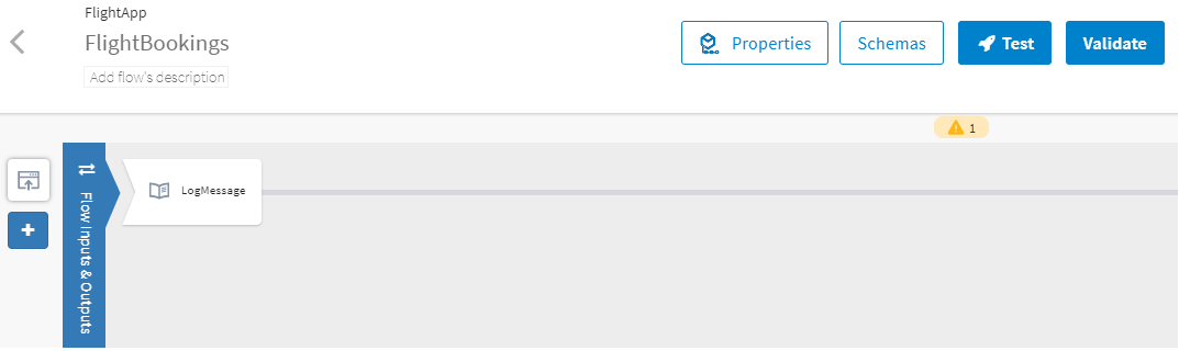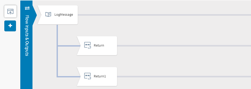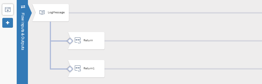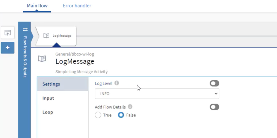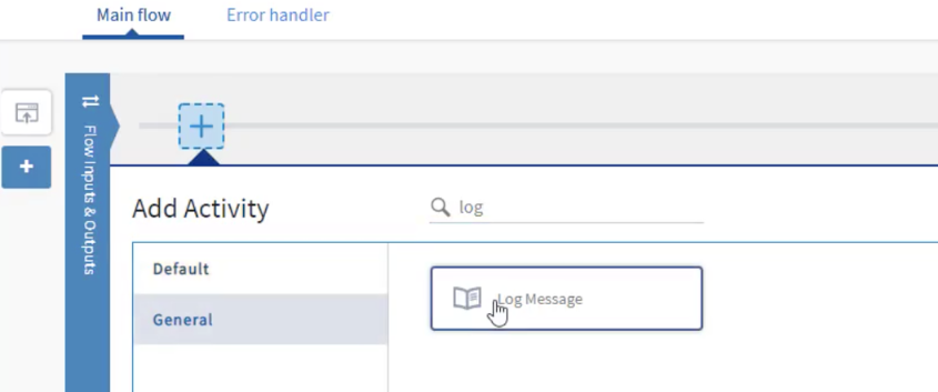 - Close the LogMessage dialog box. The LogMessage activity is added to the right of the Flow Inputs & Outputs tab.