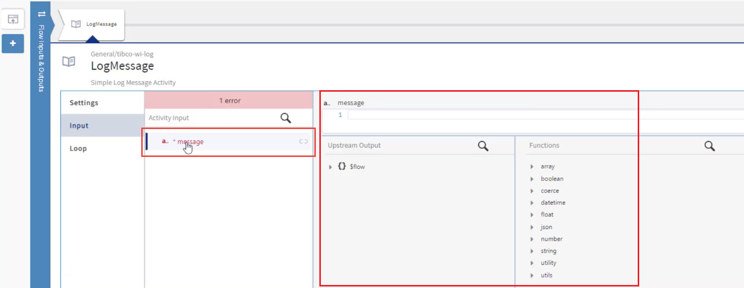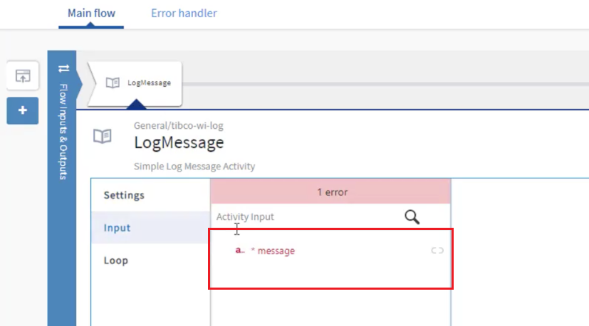 - Click the Input tab. An Activity Input column is displayed on the right side of the LogMessage activity’s tabs. This column lists the activity inputs. In the Activity Input column, message appears highlighted in red as the configuration of this activity input is mandatory.