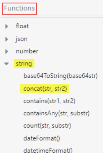 - To configure the message, in the Functions section, expand string. Click concat(str, str2) to add the function to the message box. As the box is populated, the error message is cleared.
