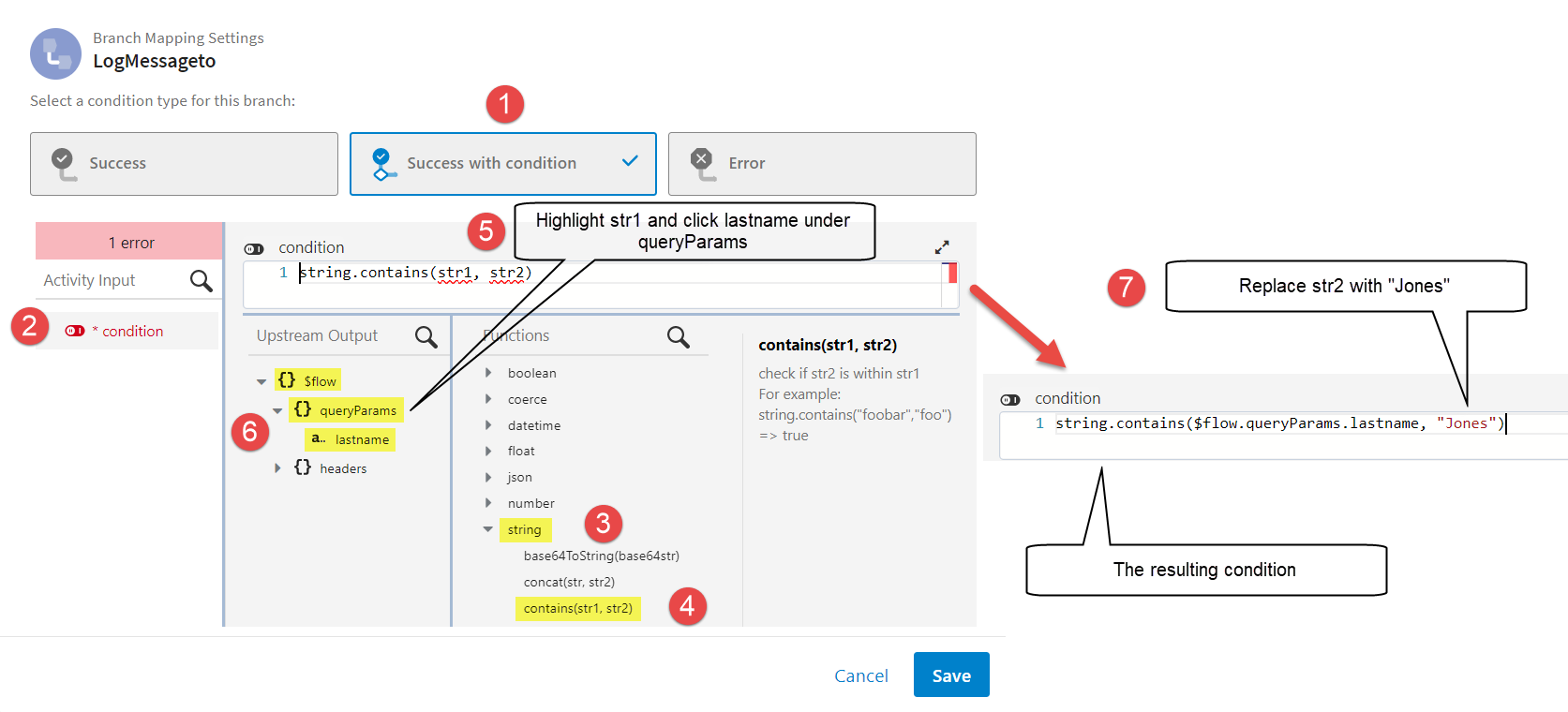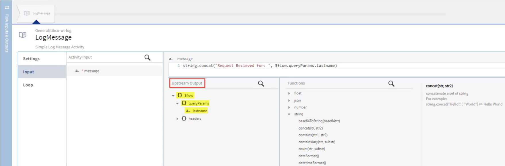 Configure str1 in the expression to take the value of the last name that the user enters: In the Upstream Output, expand $flow > queryParams, and select lastname. This last name is the name entered by the user in the search query.