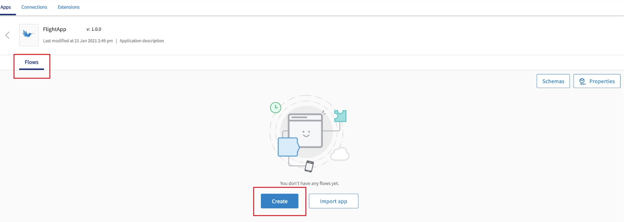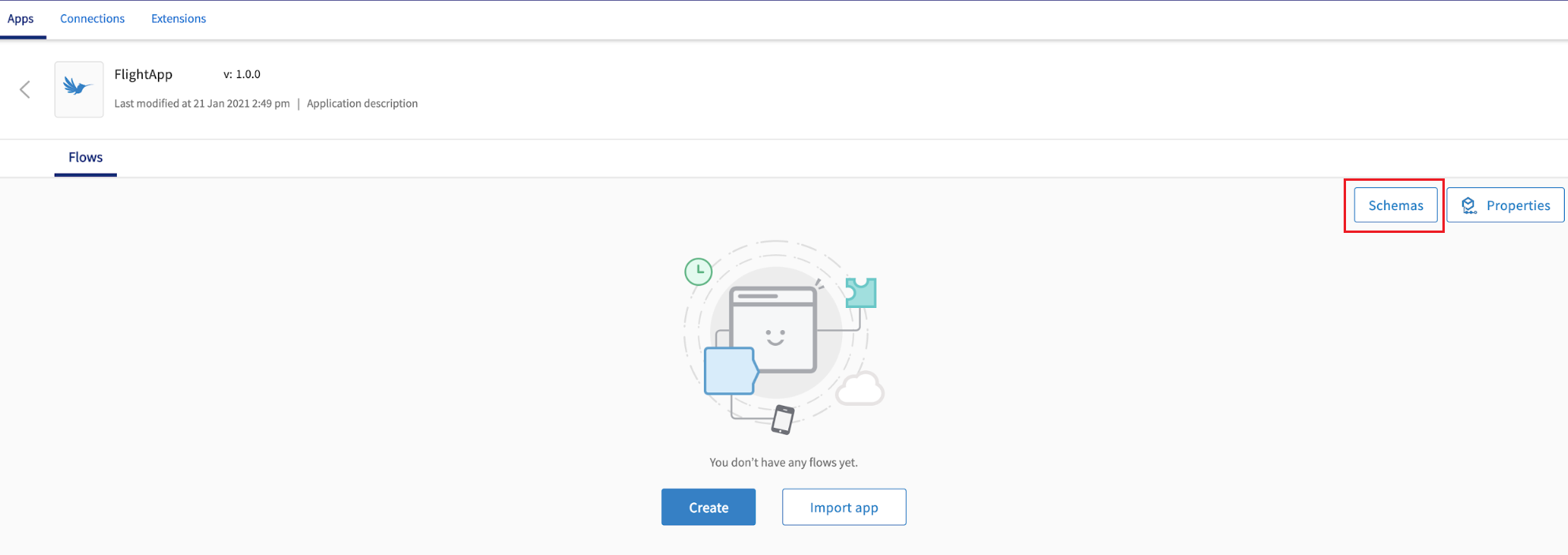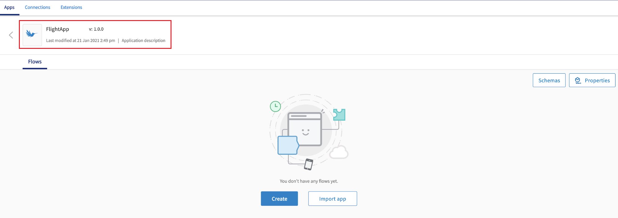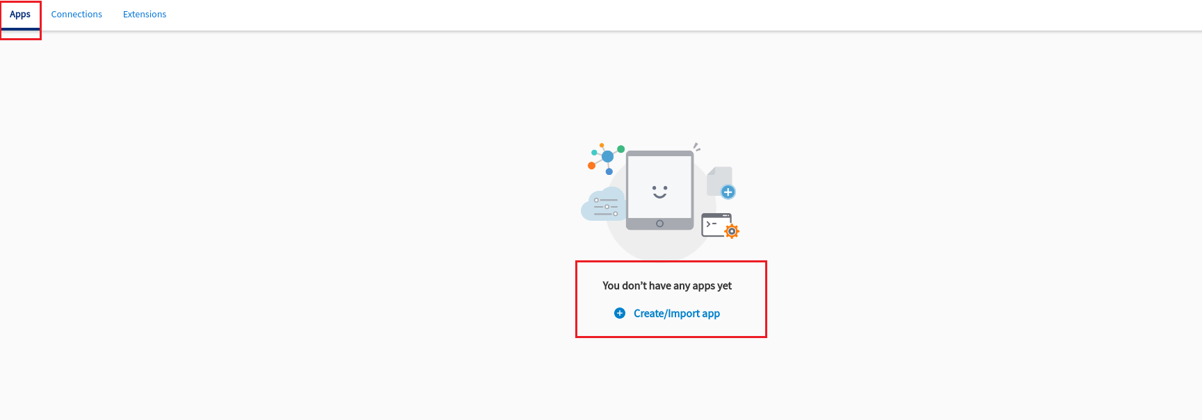 If this is your first app, a blank screen appears suggesting that you need to create or import a new app. If you have already created apps earlier, the apps are displayed on this screen.