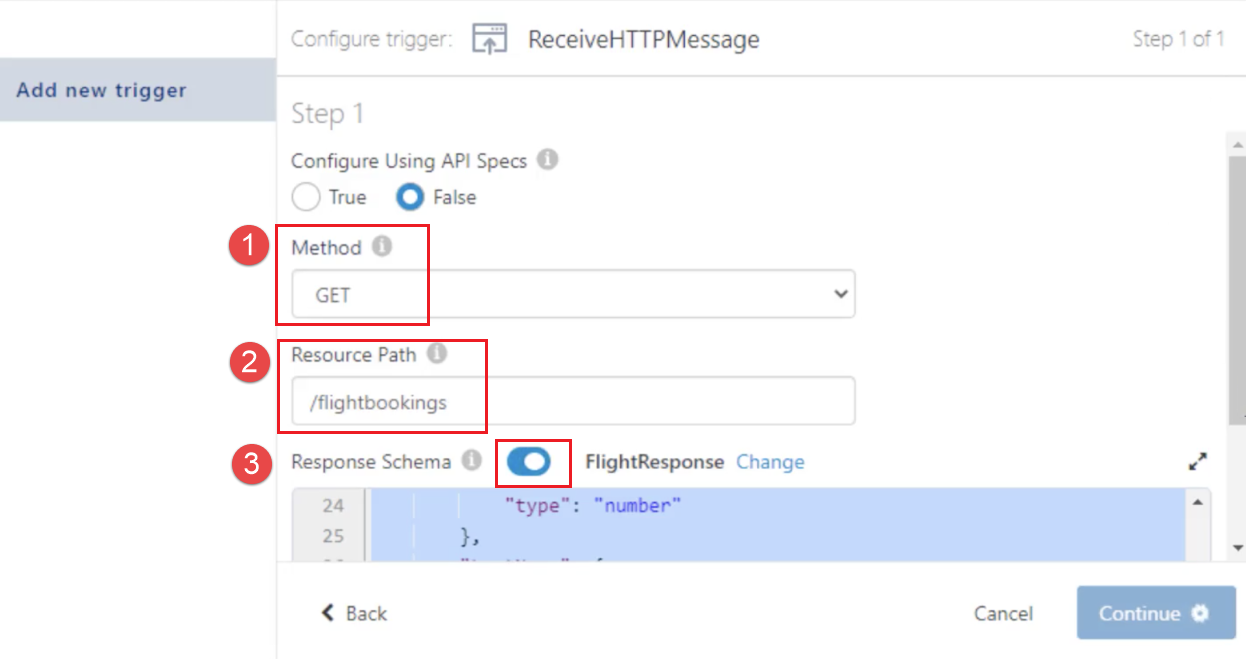 /flightbookingsin the Resource path box. - Enable the Use App Level Schema toggle next to Response Schema to open the Schemas dialog box and select the FlightResponse schema you defined earlier.