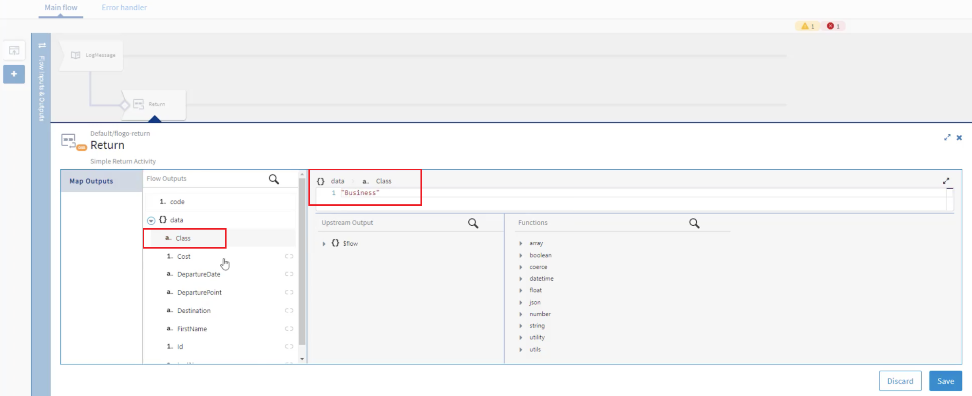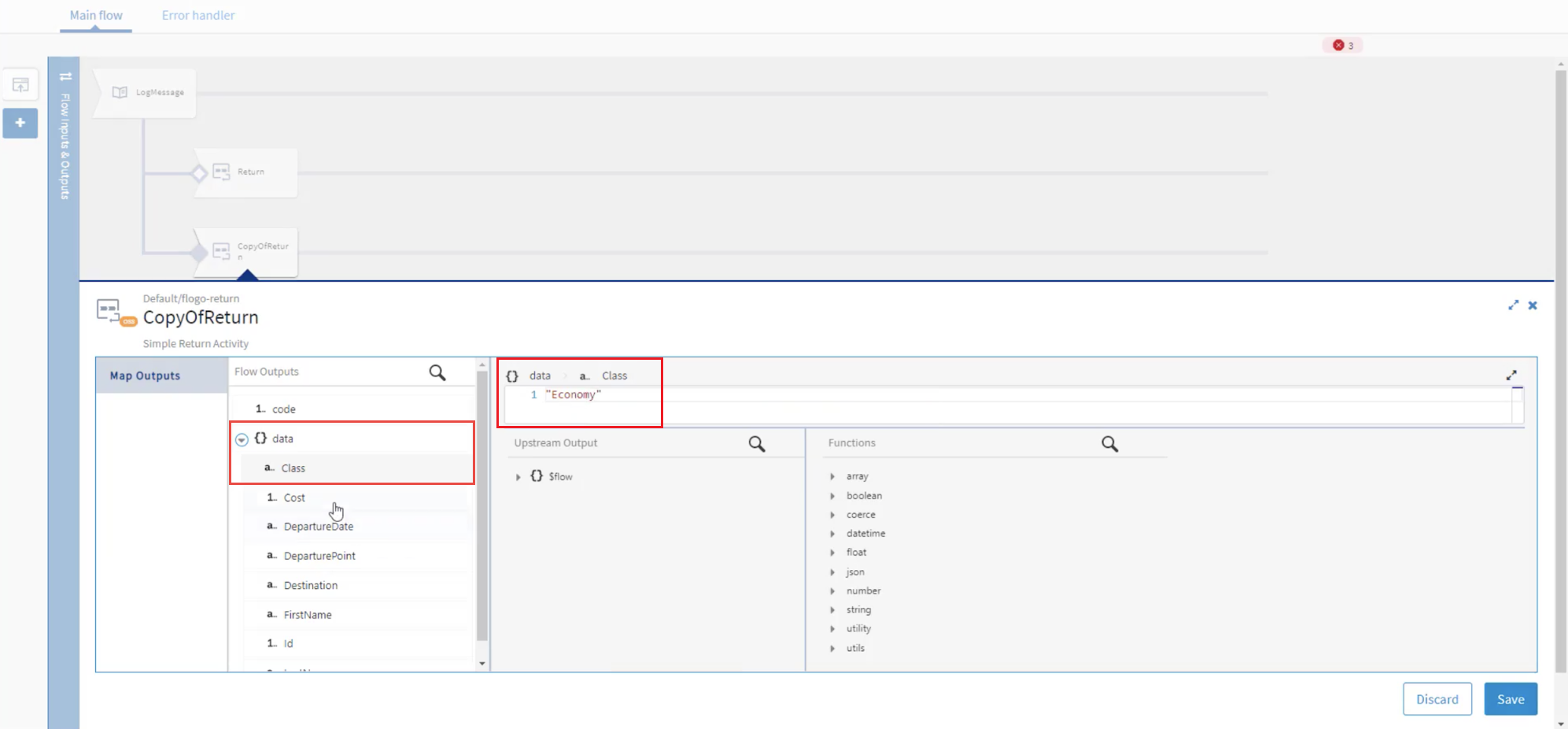- In the Flow Inputs section, expand data, select Class, and type “Economy” as this branch should return Economy Class bookings.