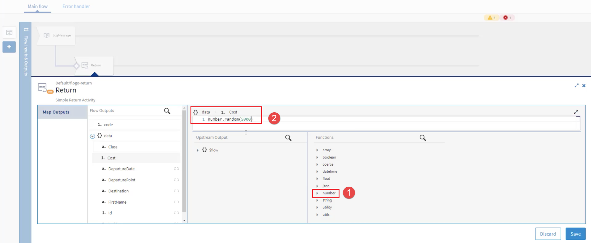 - Click Cost to type a number of your choice. You can also use a function to randomize the value. To do so, in the Functions section, expand the number category and click random(). Enter 5000 as an input parameter to the random() function.