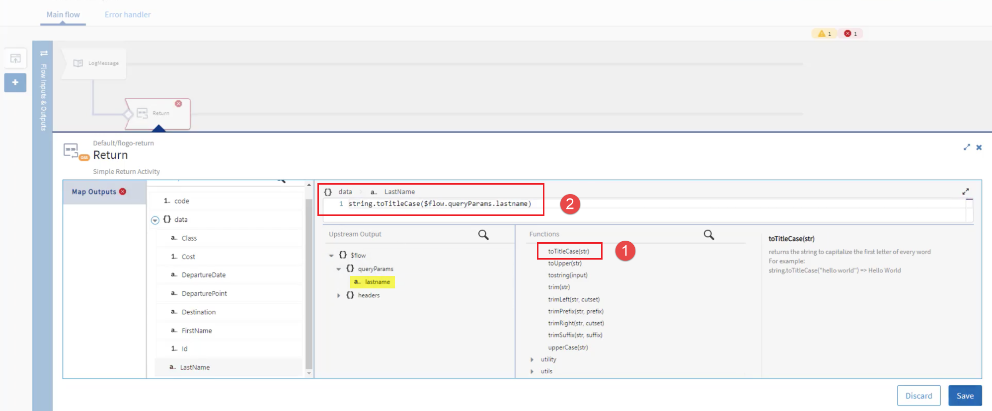 - Click LastName to map this field to the query parameter lastname. Before doing so, we can use a string function to capitalize the last name that is returned by our app. To do so, under Functions, expand string and click toTitleCase(str). Once string.toTitleCase(str) is added to your box, select str to replace it with the query parameter. Expand $flow and then queryParams under Upstream Output and click lastname. The box should look like this: