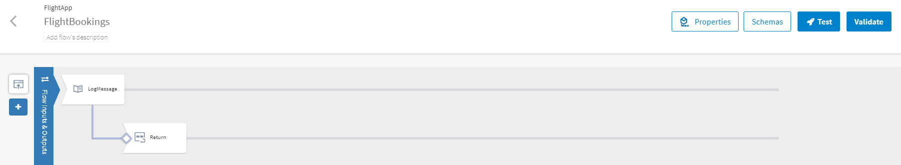 - FlightBookings flow: This flow is attached to the ReceiveHTTPMessage trigger. This flow handles the business logic of the app. In this flow, you must configure a LogMessage activity to log a custom message when a request is received successfully. The LogMessage activity has two success branches: