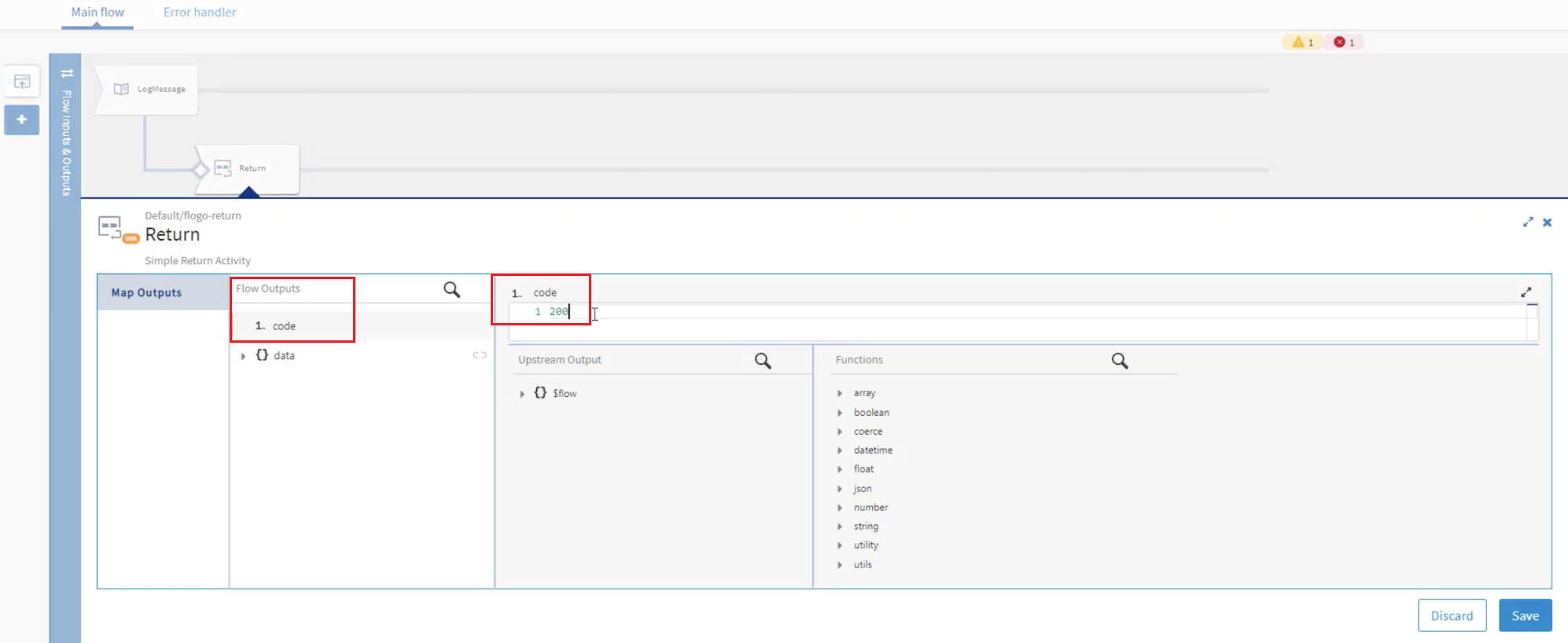 - Click code under Flow Outputs to open the mapper and type 200 in the code box, which is the HTTP success code.