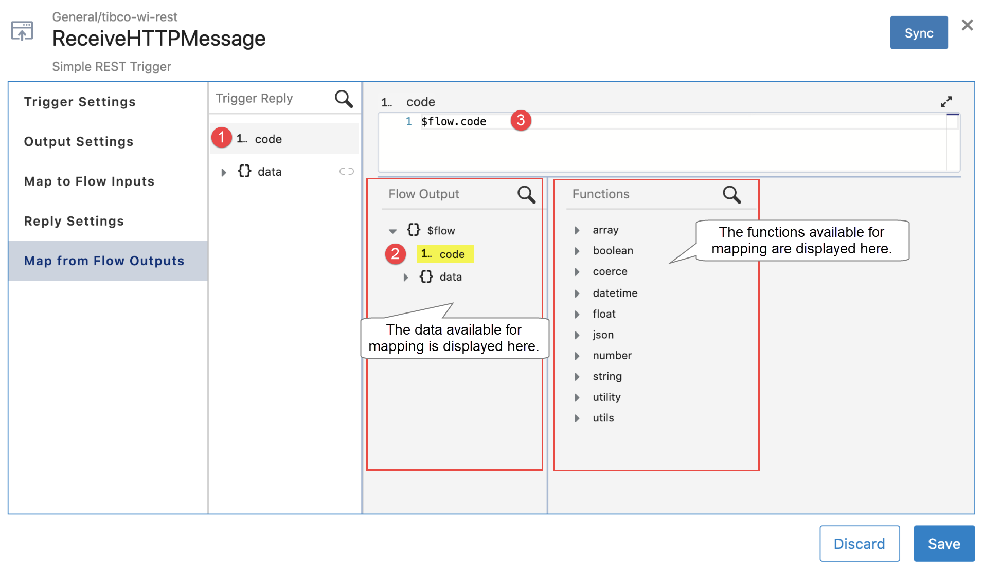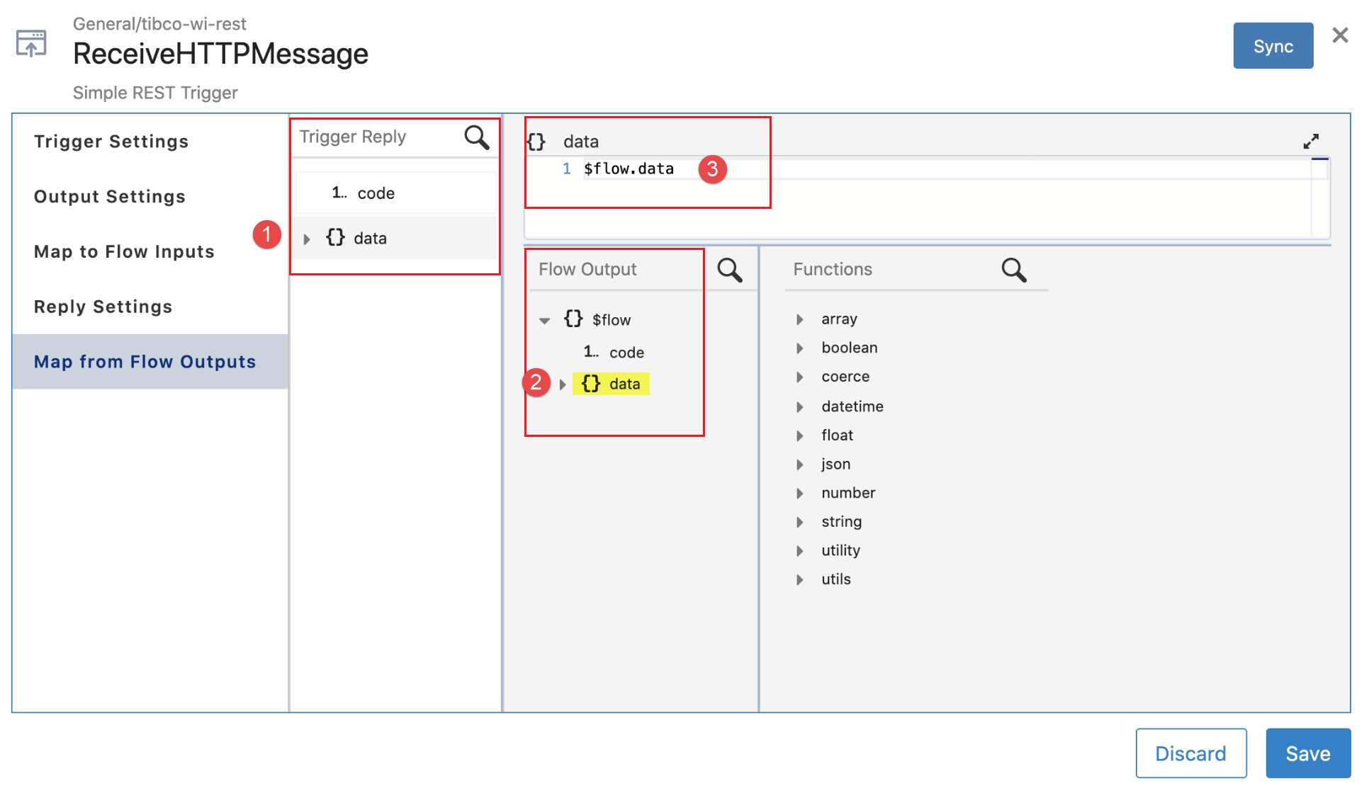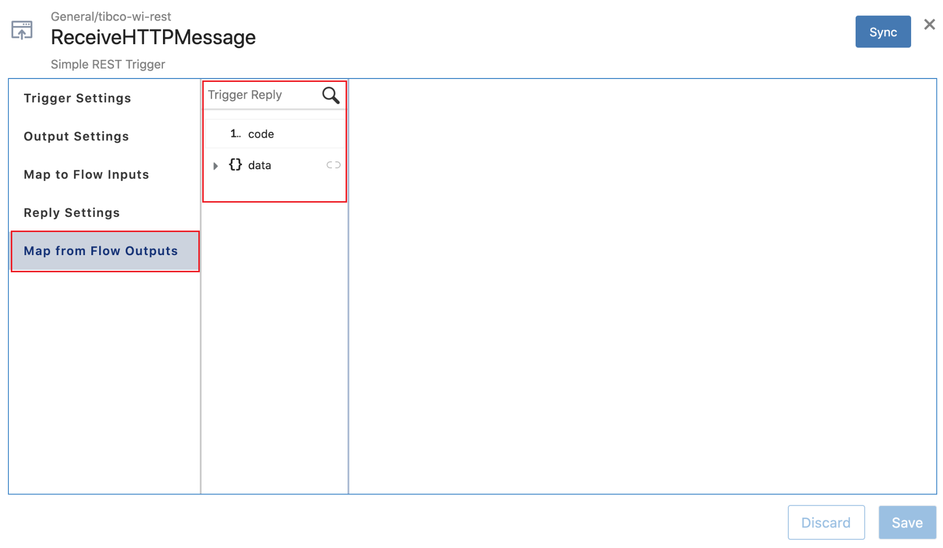 When the execution of the flow is completed, the output must be sent back to the trigger for the trigger to send a reply to the REST request initiator. Hence, the flow output data must be mapped to the trigger reply, which then returns the result of the flow execution to the REST request initiator.
