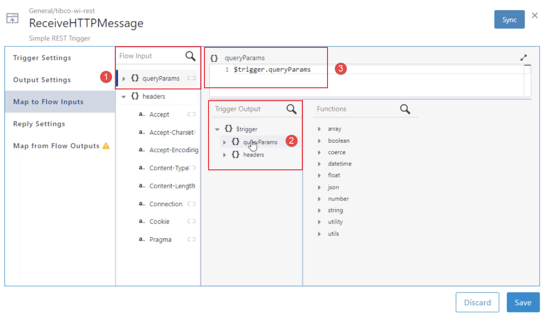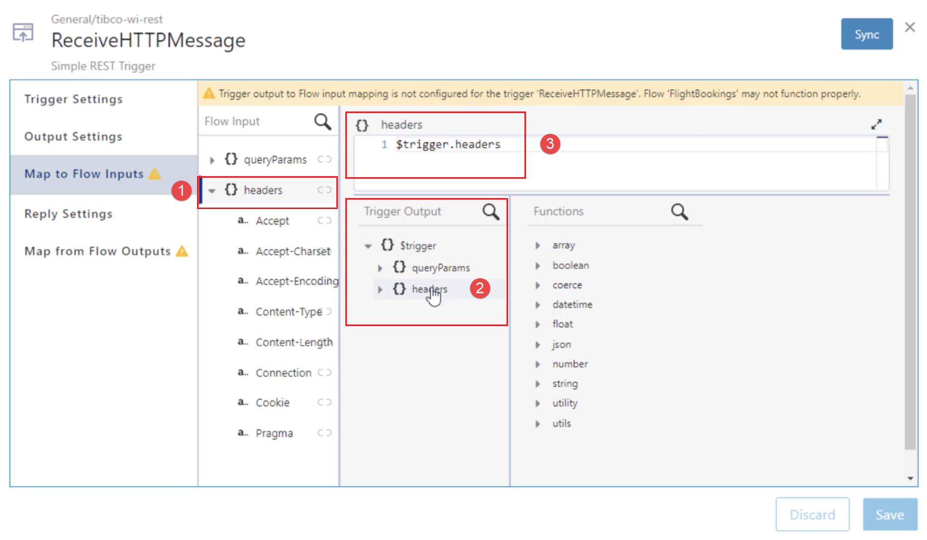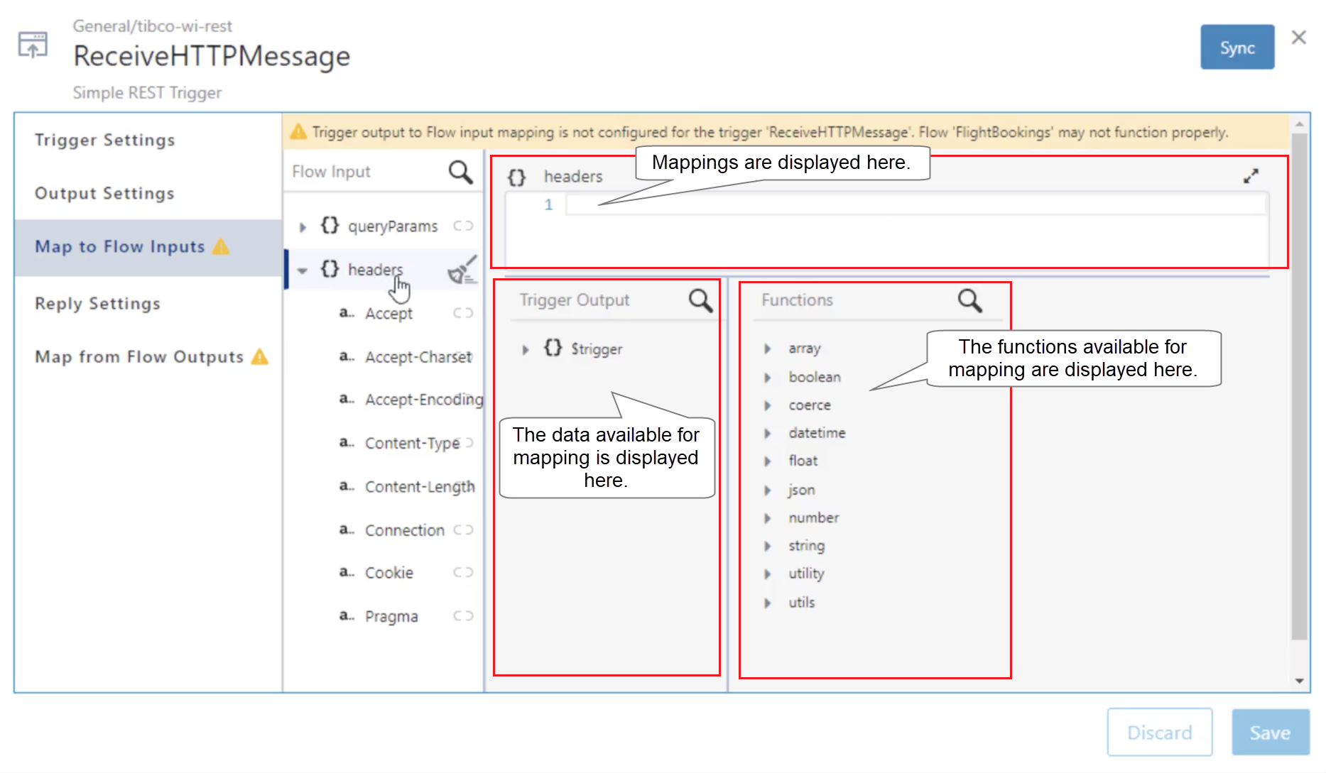 - To map the Trigger Output headers to the Flow Input headers, in the Trigger Output section, click $trigger and then click headers.