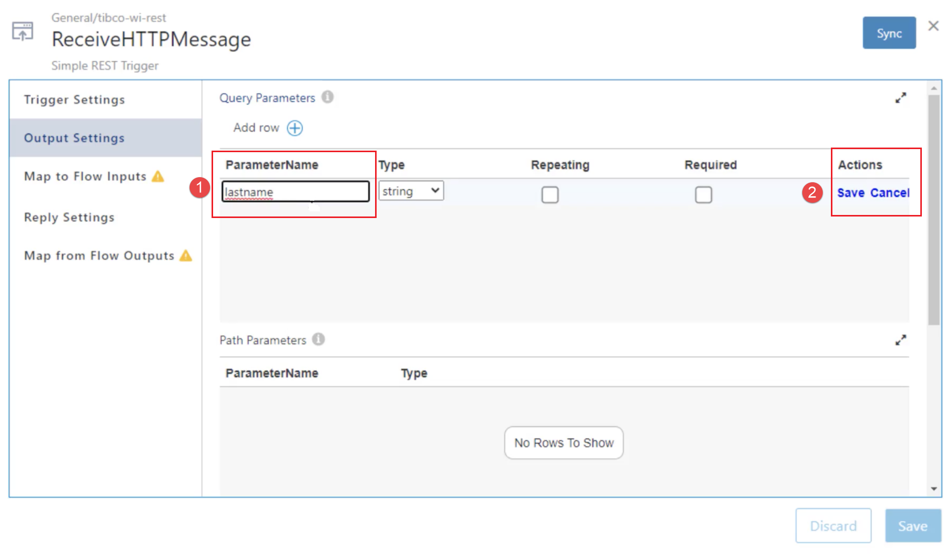 lastnameand click Save in the same row (in the Action column).To start the mapping, click the Map to Flow Inputs tab and configure the mapping of the trigger output. On the Map to Flow Inputs tab, the Flow Input section is displayed. This is the list of flow inputs that can be mapped to the trigger outputs. Only headers are displayed in the flow inputs. The new query parameter is not visible yet.