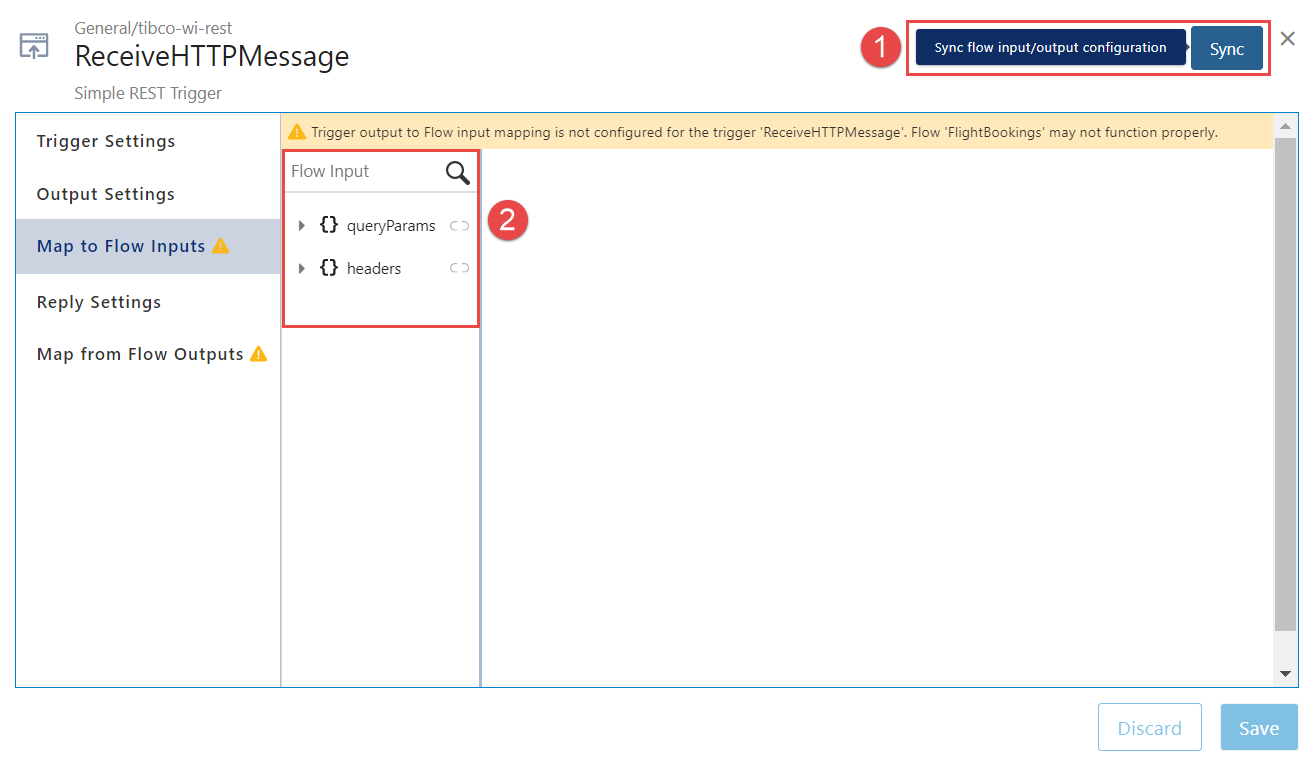 When Flogo Enterprise receives a request from a passenger (a REST request), the data from the request is output by the ReceiveHTTPMessage REST trigger. For the request to be processed, this output must be used by the flow in the form of flow input. Hence, you must map the trigger output to the flow input.