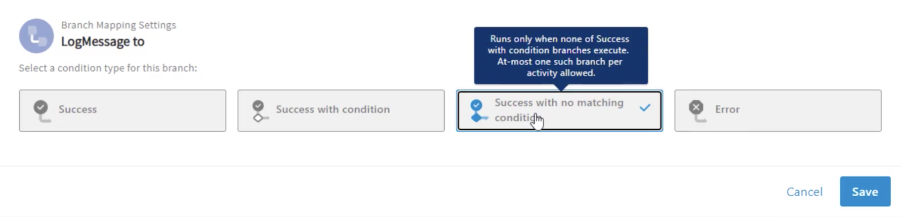 In the Branch Mapping Settings dialog box that opens, select the Success with condition branch condition.