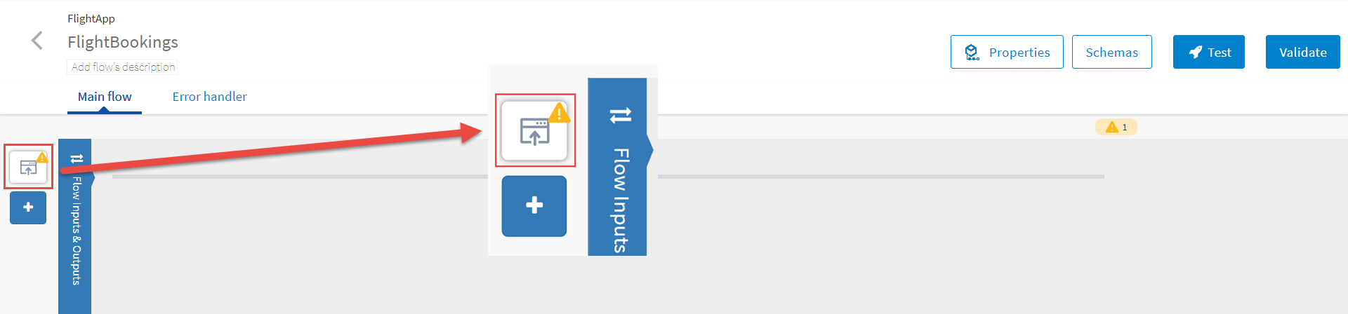 Your app is now ready. Before you push the app to the Cloud, validate all the flows to confirm that there are no errors or warnings. To do so, click Validate. Flogo Enterprise validates each flow and activity within the flow. If there are any errors or warnings, you see the respective icons next to the flow name or activity tab which contains the error or warning.