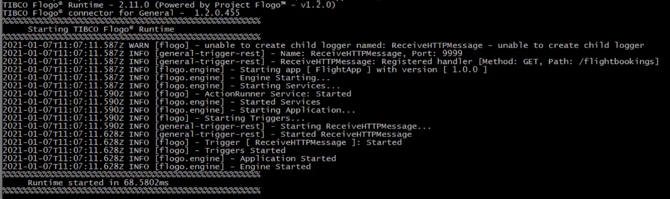 9999, path/flightbookingsand query parameterlastname. For example,http://localhost:9999/flightbookings?lastname=jones. - Go back to your terminal. You should see the logs you configured with the Log activity.