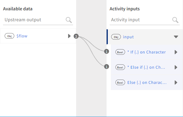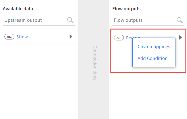 You can add conditions in your data mappings to get outputs based on those conditions. You can add conditions to primitive objects, nested arrays, nested objects, and any other type of input. if/else conditions are available in activities and triggers in the main flow and error handler.