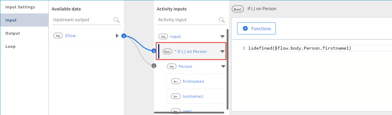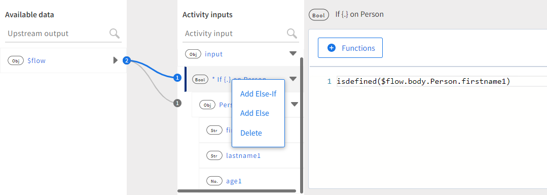 Ifcondition, enter an expression whose result evaluates to a Boolean value. You can enter the expression manually or map data from the Available data pane. If children elements exist, you can enter values for them. -