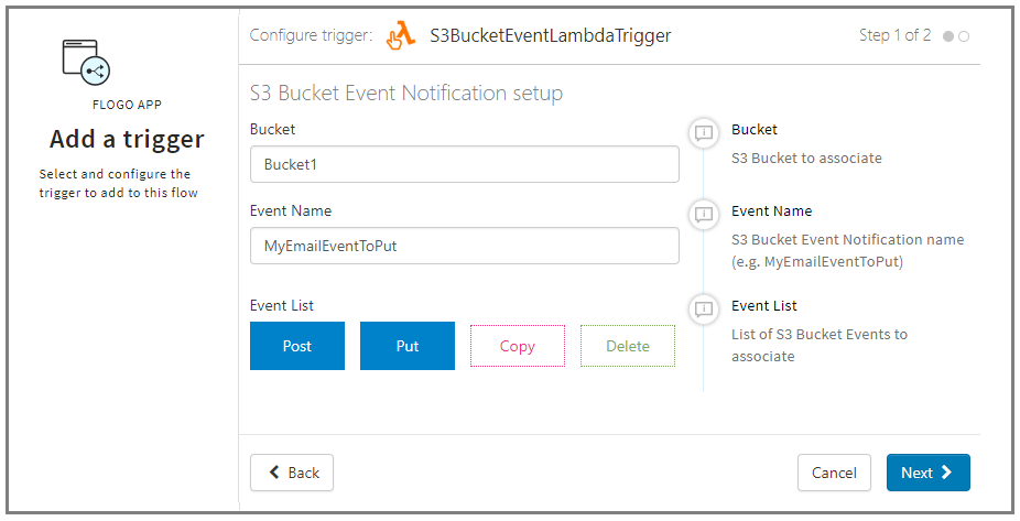 8. Provide the bucket name, event name, and the list of events to be performed. See the "S3 Bucket Event Lambda Trigger" section in the TIBCO Flogo® Enterprise Activities, Triggers, and Connections Guide for details.