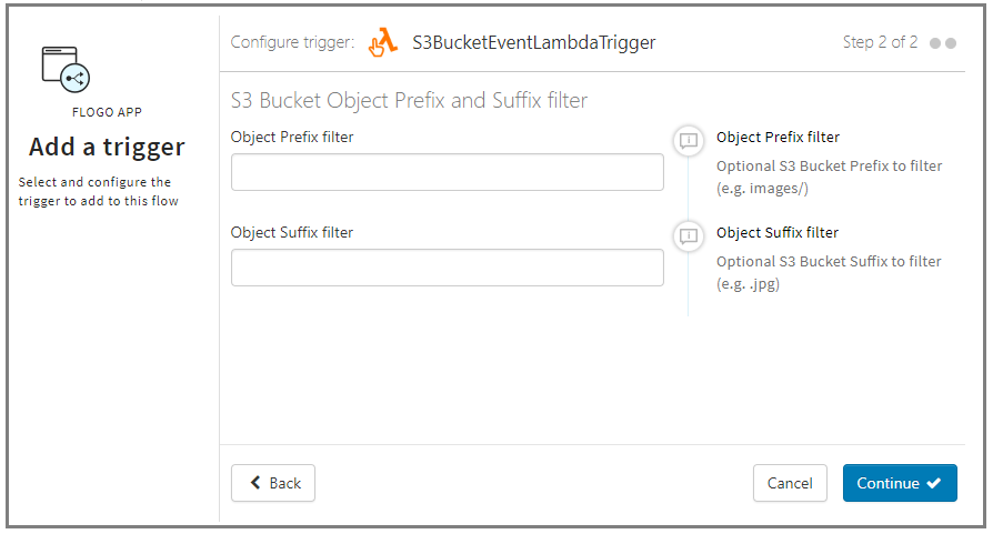 Refer to the "S3 Bucket Event Lambda Trigger" section in the TIBCO Flogo® Enterprise Activities, Triggers, and Connections Guide for details on the trigger. To create a flow with the S3 Bucket Event Lambda trigger: