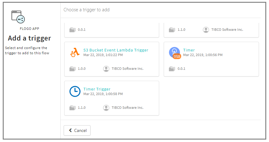12. Click the S3 Bucket Event Lambda trigger tile and configure its properties. See the "S3 Bucket Event Lambda Trigger" section in the TIBCO Flogo® Enterprise Activities, Triggers, and Connections Guide for details.