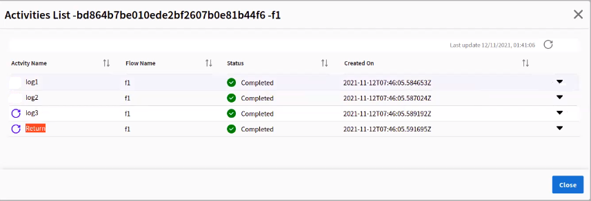 Name Description Status Status Flow Name Name of the flow. Execution ID Instance ID of the flow. App Instance ID Instance ID of the app. Duration (ms) Duration for which the flow was running. Start Time (UTC) Time when the flow was started, based on Coordinated Universal Time (UTC). End Time (UTC) Time when the flow ended, based on Coordinated Universal Time (UTC). - View details of a flow: For each flow, you can view its details by clicking View Details. A list of activities executed is displayed: