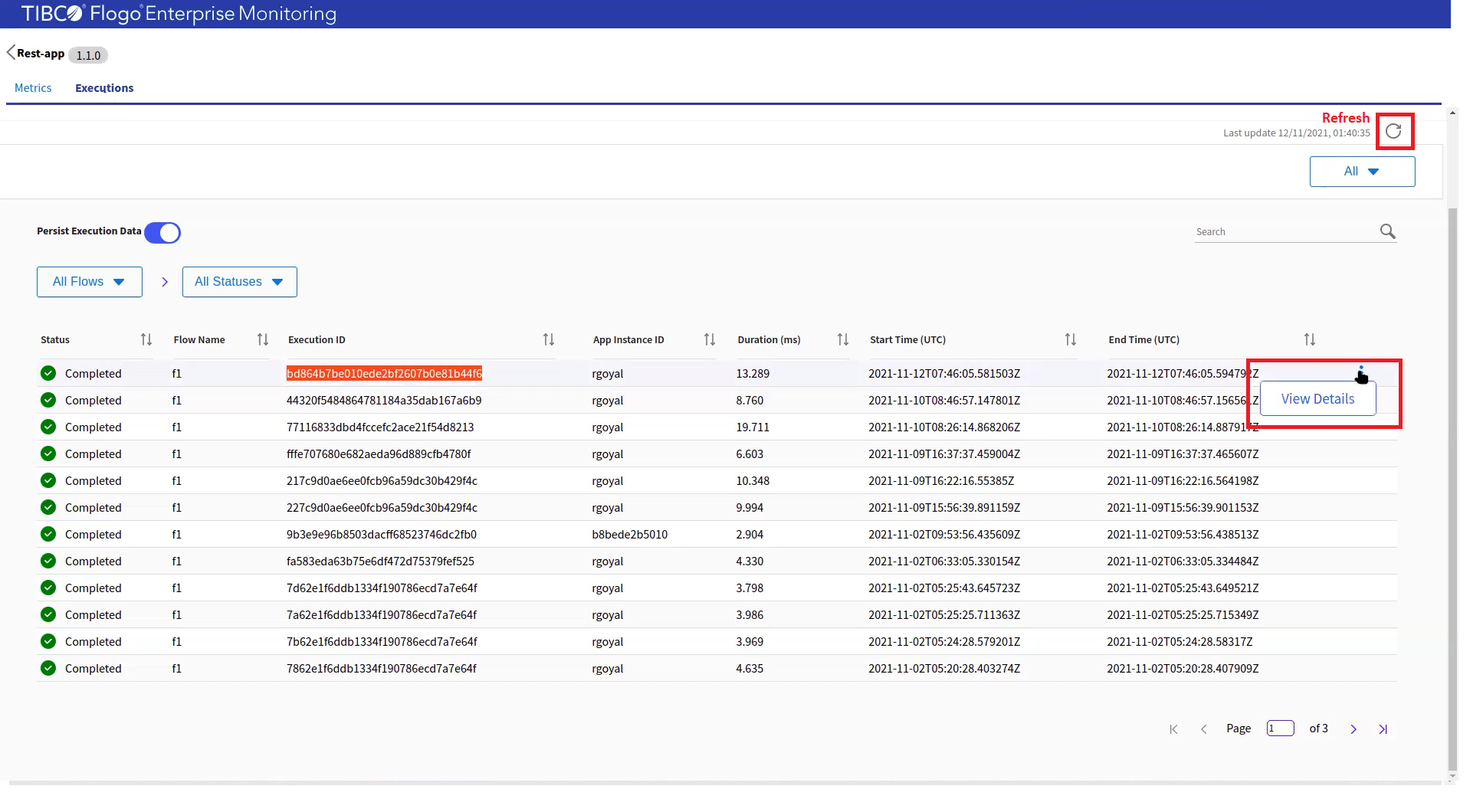 icon. The Executions page is also updated with the latest data. Click