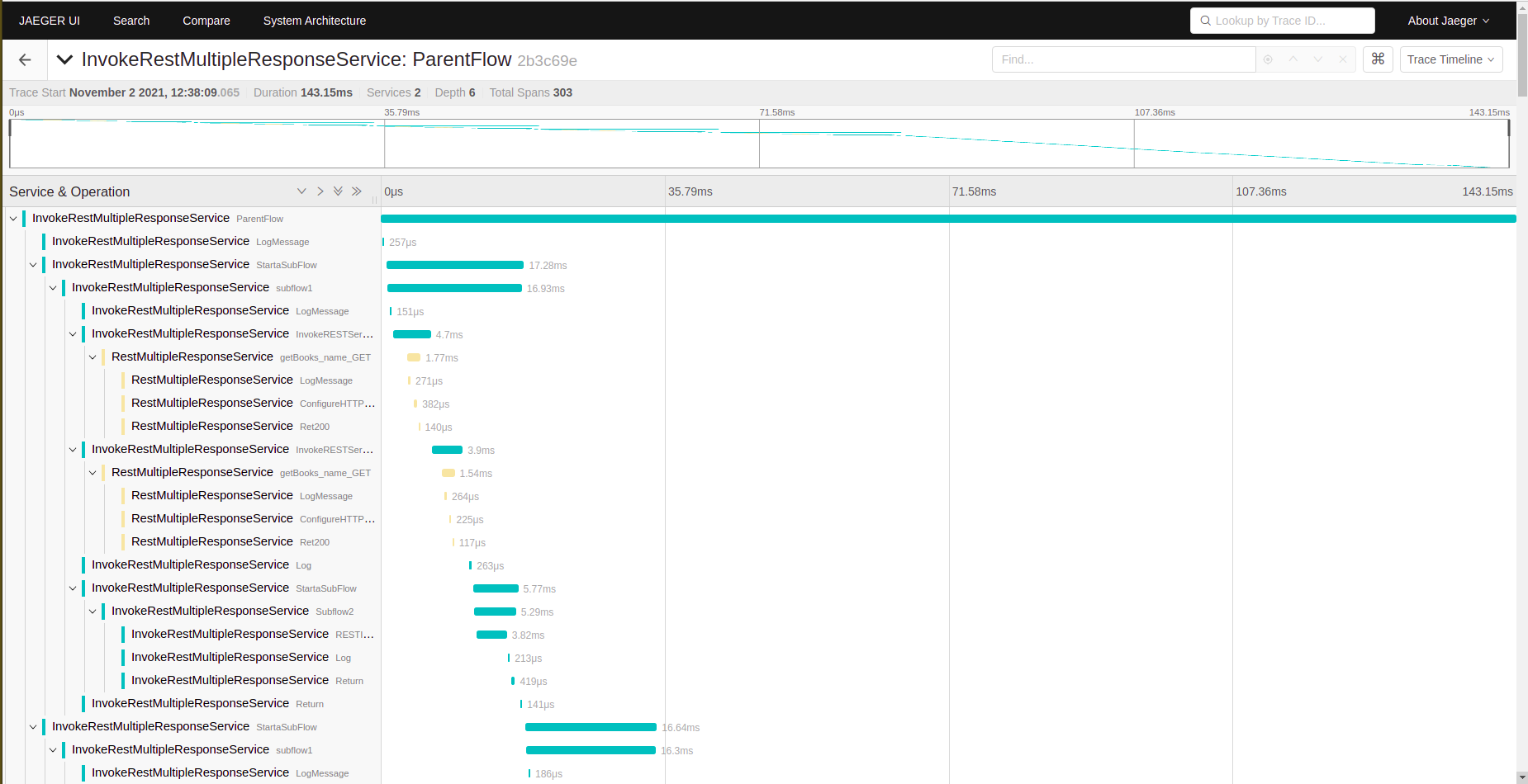 The following screenshots show traces from one Flogo app on two different observability vendor tools, Jaeger and Zipkin.