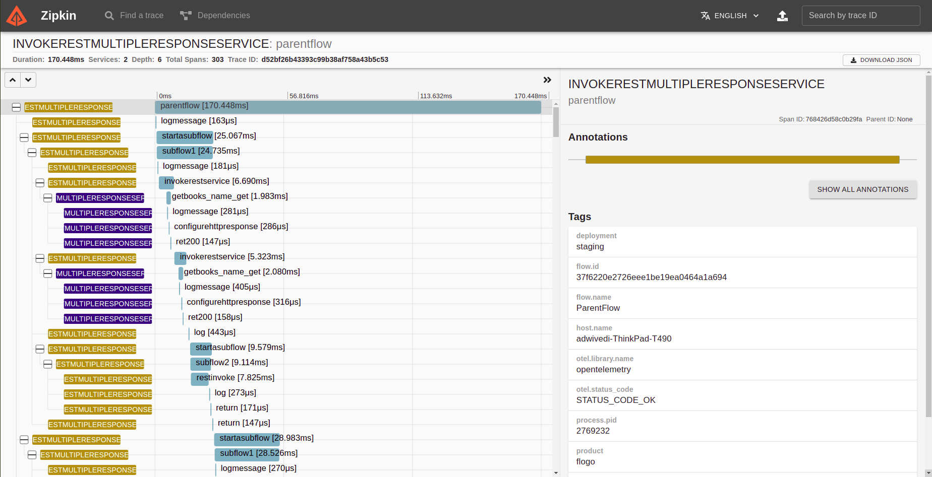 When you use this feature, traces of the Flogo app are sent to the OpenTelemetry Collector. OpenTelemetry Collector has vendor-specific configurations that allow you to send these traces to supported observability vendor tools. For example, you can specify Zipkin-specific configurations in the otel-zipkin-collector-config.yaml configuration file for the traces to be displayed on the Zipkin dashboard.