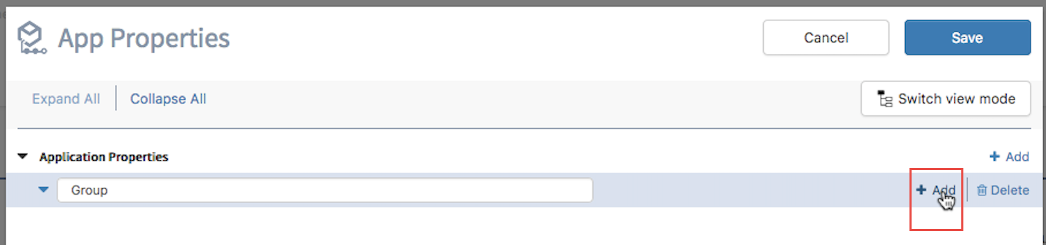 You can create one or more standalone app properties or group app properties such that they show up in a hierarchy. A group (or hierarchy) consists of a parent node, which is just a label and does not have a data type associated with it. You must create properties within the parent. You can do so in the Application Properties dialog box. When creating a group you must add the parent first and then create the app properties under the parent.