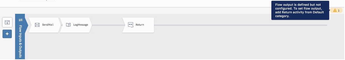 Activity and Trigger level reporting - When you click on a flow name, the flow details page opens displaying the implementation of the flow. This page displays errors if any at the activity level. For instance, the LogMessage activity below displays an error symbol within the activity configuration. You should resolve the error before proceeding.