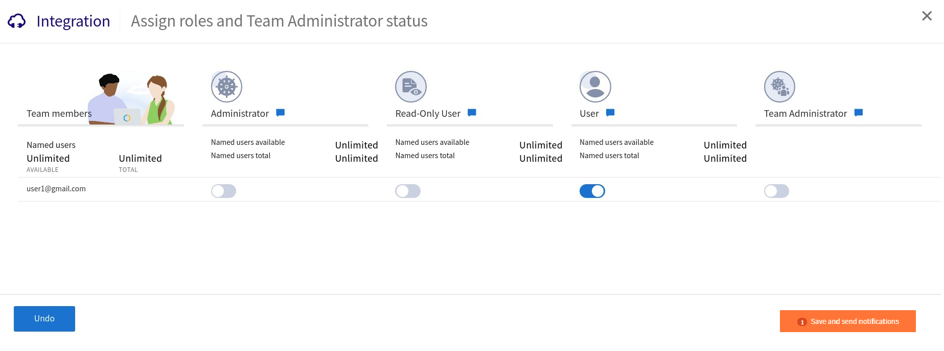 On the Assign roles and Team Administrator status page, select the appropriate available roles for the users and then click Save and send notifications. The members receive an email inviting them to join the domain capability. The email includes the region from which the domain capability is subscribed.
