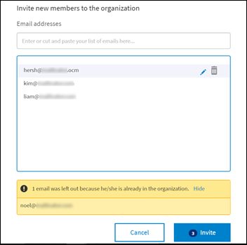 If you type the email address of an existing organization member, the email address is not added again to the list of invitees. A message informing you about it is displayed at the bottom on a yellow band.