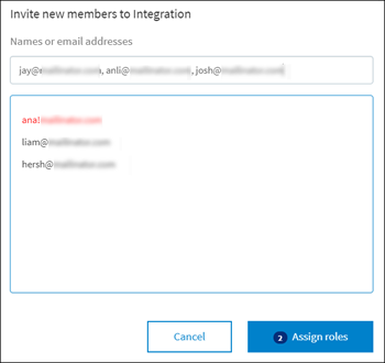 If a matching first name, last name, and email address are displayed in the list, it indicates that the user is already a member of the organization. If only the email address is displayed in the list, it indicates that the user is not a member of the organization.