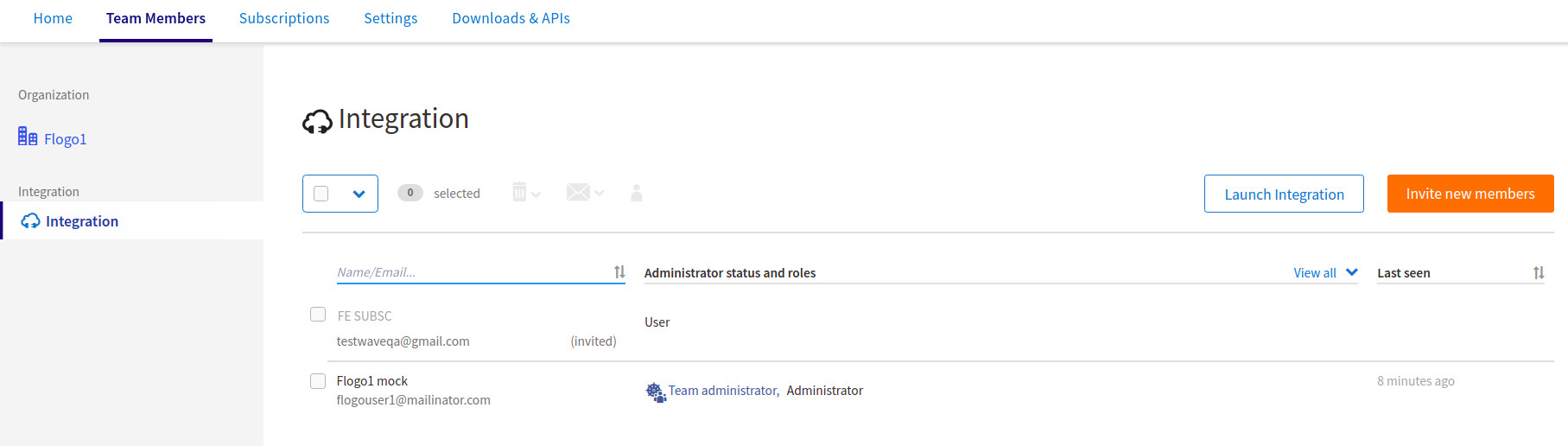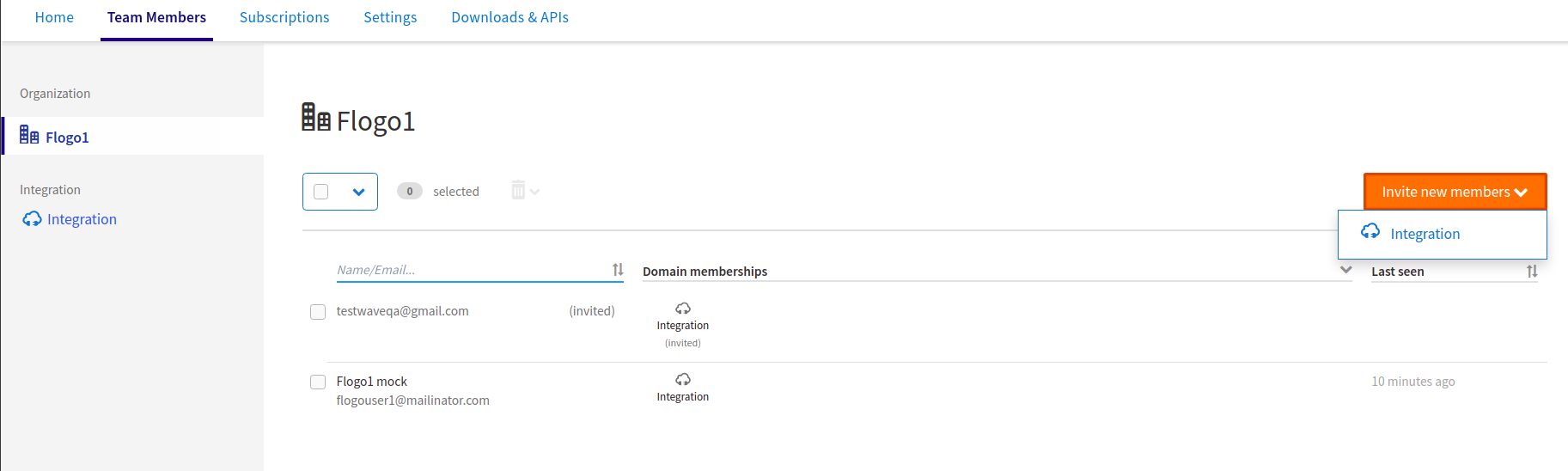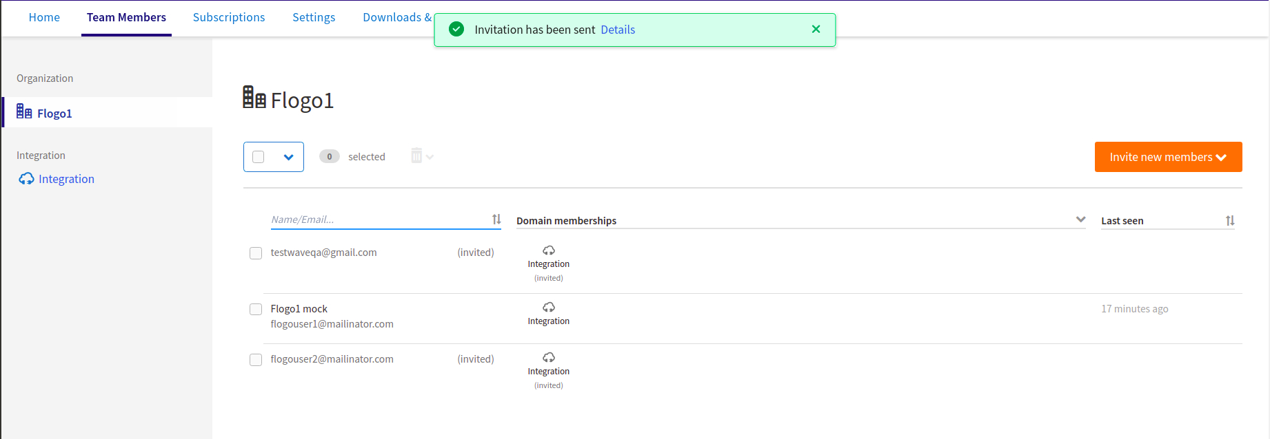 On the Team Members tab, click the name of a domain capability you have subscribed to, such as Integration, and then click Invite new members.