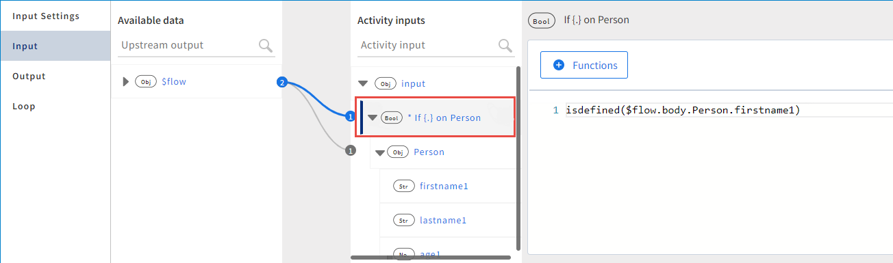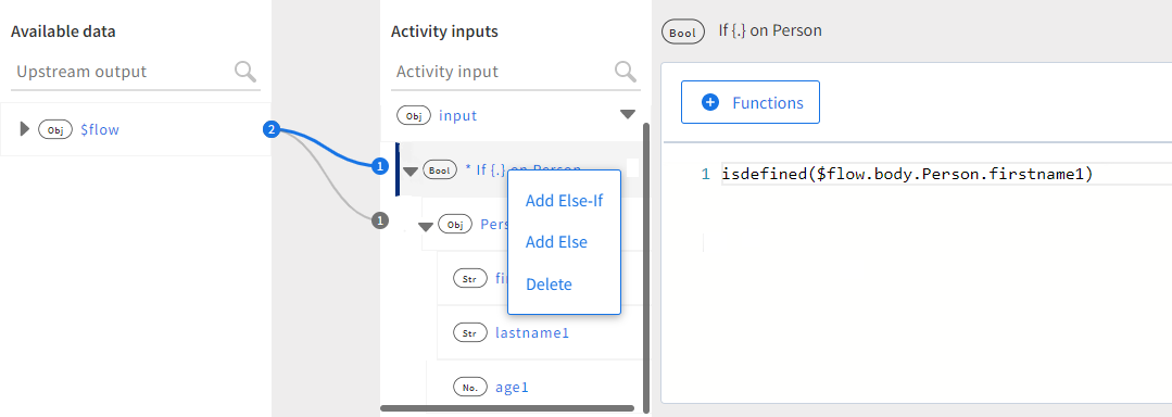 Ifcondition, enter an expression whose result evaluates to a Boolean value. You can enter the expression manually or map data from the Available data pane. If children elements exist, you can enter values for them. -