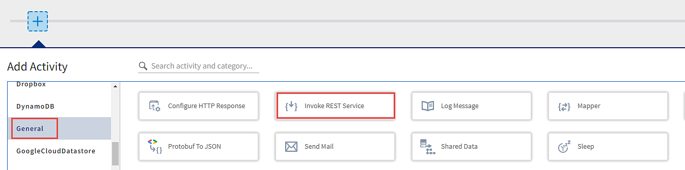on the plus tab. - In the Add Activity dialog, go to the General tab and select the Invoke Rest Service activity.