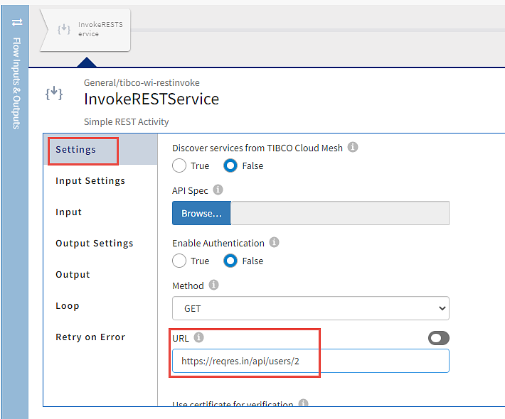On the Settings page, in the URL field, provide the URL for the Rest API that is to be invoked, set the method as GET, and click save.