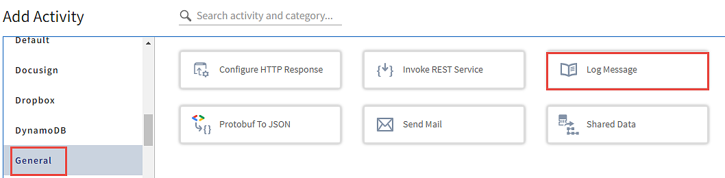 - On the Add Activity page, go to the General tab and click the Log Message.