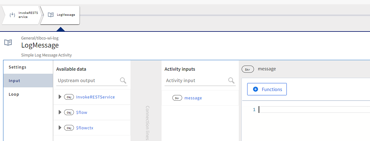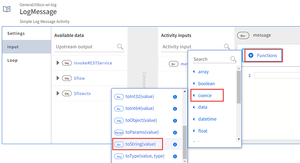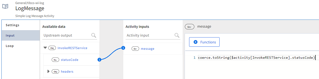 - Configure this log message activity to log the status code received from the InvokeRESTService activity. To use a function in the editor, click the Functions button, expand the string and select coerce.tostring(value).