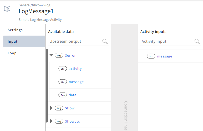 The Map to Flow Inputs tab of the error activity has three elements, activity, message, and data. The activity element is used to output the name of the activity that is throwing the error, the message element is used to output the error message string, and the data element can be configured to output any data related to the error. The message element on the Input tab of any activity in the Error Handler flow can be configured to output one or all of these three elements.