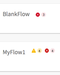 Flow level reporting - When you click on an app name, the app details page opens displaying the list of flows in the app. If there are errors or warnings in a flow, appropriate icons are displayed next to the flow name along with a number, where the number indicates an aggregate number of errors or warnings in the flow. If there are no errors or warnings, these icons are not displayed. In the image below, BlankFlow flow has three errors and MyFlow1 has 4 errors that should be resolved and 4 warnings that can be ignored.
