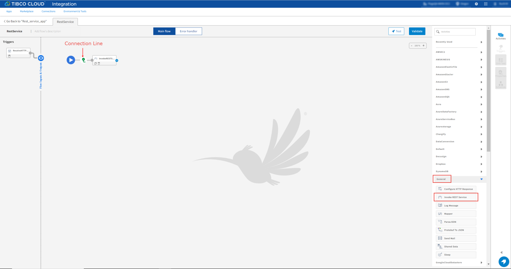 Drag this Activity from there to anywhere in the canvas. Drop a connection line between the StartActivity and the Invoke REST Service Activity. This represents the order in which the Activities are performed.