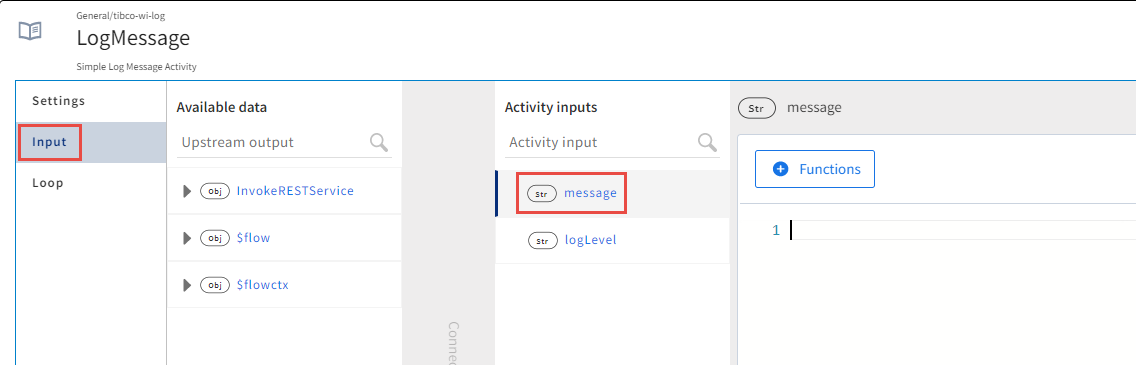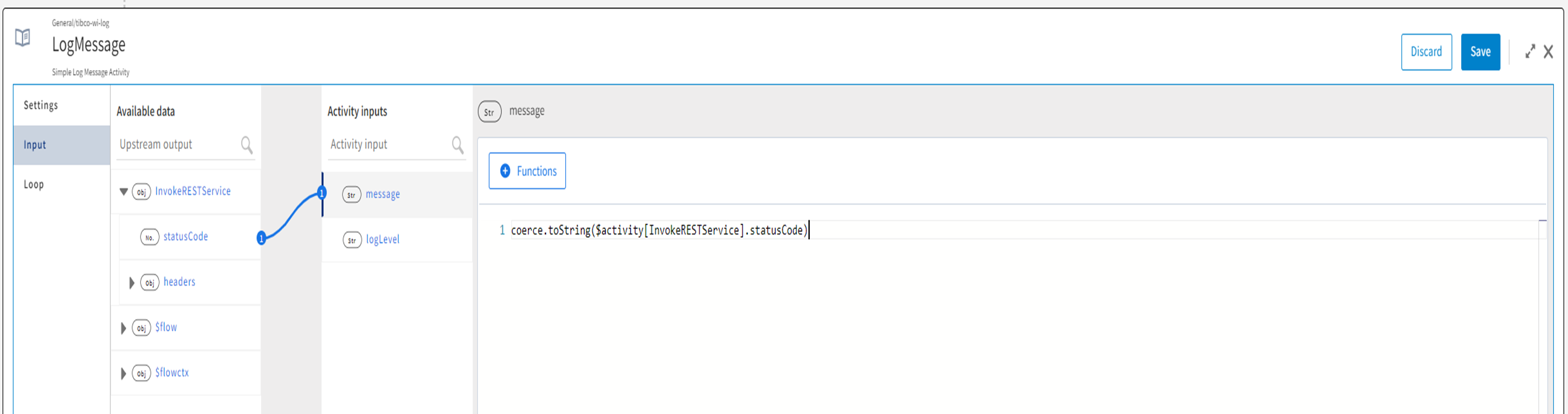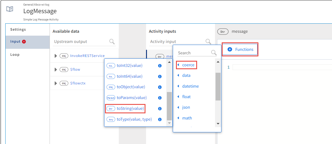 - Configure this Log Message Activity to log the status code received from the InvokeRESTService Activity. To use a function in the editor, click the Functions button, expand the string and select coerce.tostring(value).