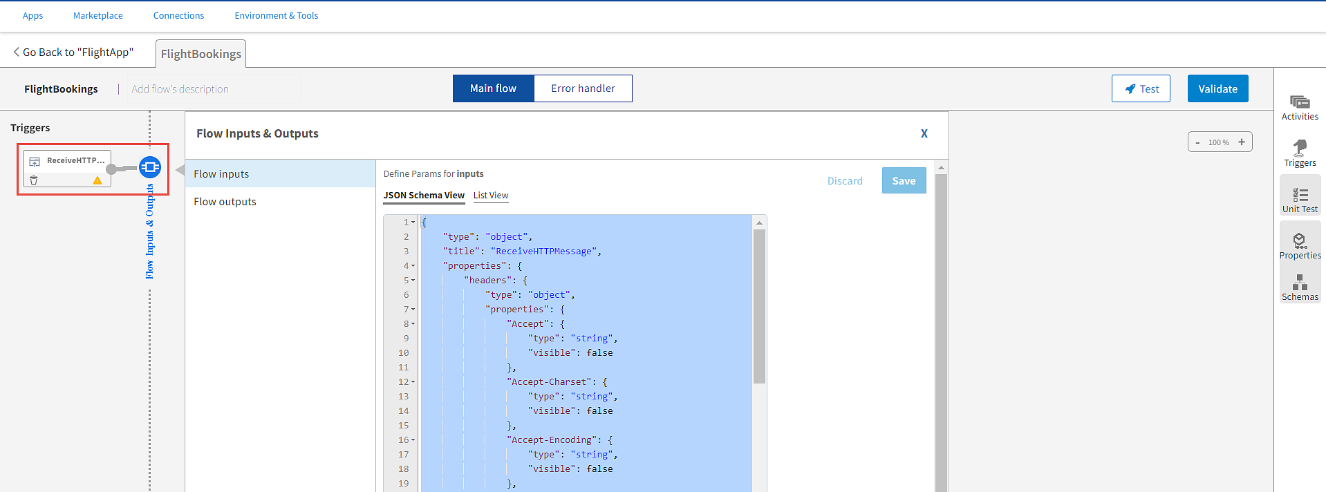 Every app must have at least one flow and, in most cases, a trigger that initiates the flow. Create a flow with the REST trigger. The ReceiveHTTPMessage REST trigger listens for an incoming REST request that contains the details of a passenger who wants to book a flight. Specify the fields for the request in the REST trigger in JSON schema format.