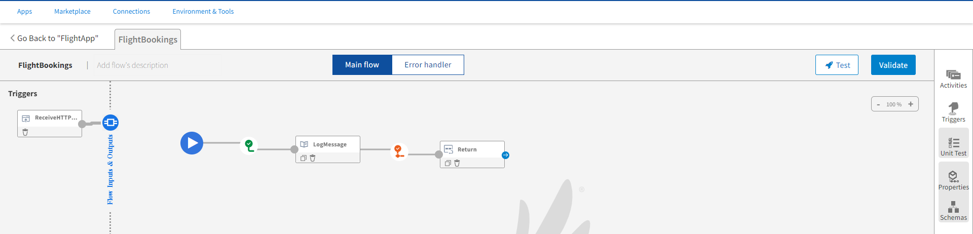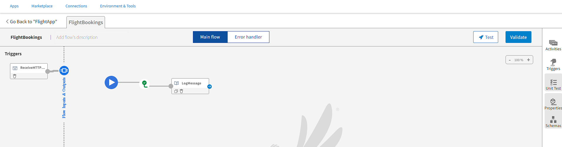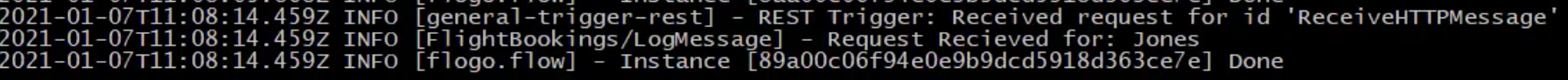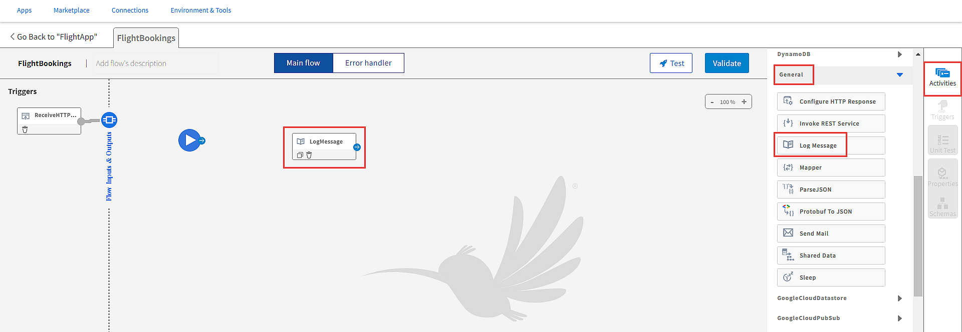 - FlightBookings flow: This flow is attached to the ReceiveHTTPMessage trigger. This flow handles the business logic of the app. In this flow, you must configure a LogMessage activity to log a custom message when a request is received successfully. The LogMessage activity has two success branches: