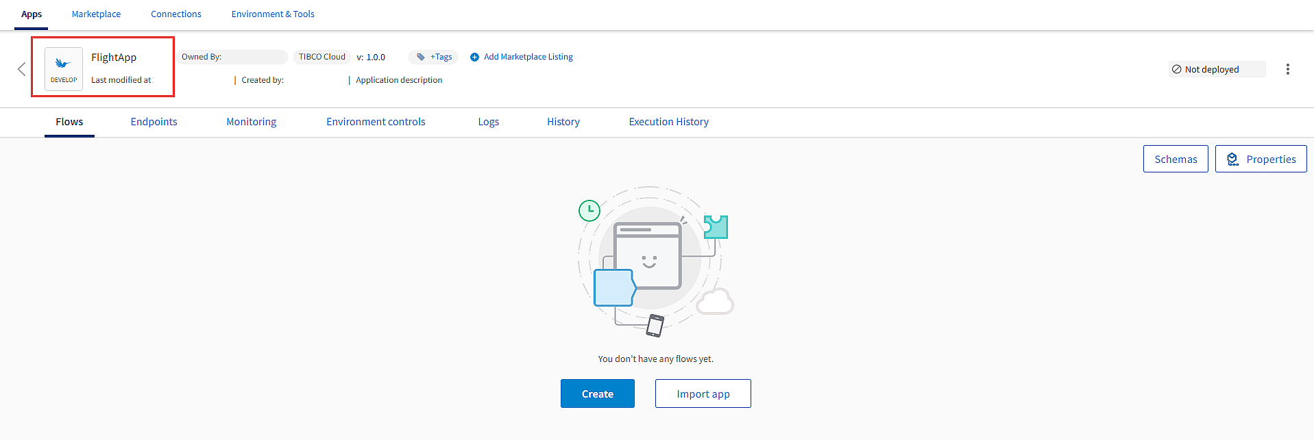 - Under Quickstart > All app types;Apps, click Create a Flogo app.